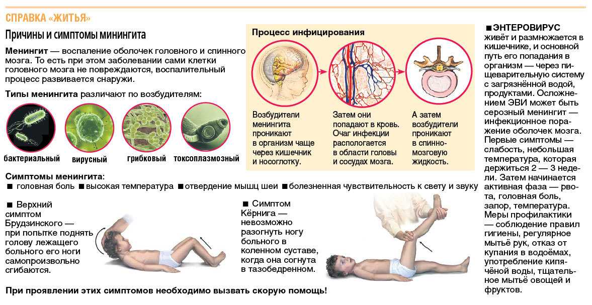 Наиболее тяжелое последствие энтеровируса – это развитие серозного энтеровирусного менингита. Он может развиться у ребенка любого возраста и распознается по следующим признакам: