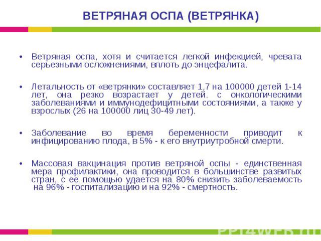 Ветряная оспа у здорового человека — это самоизлечивающееся заболевание с отличным исходом. Однако у лиц с ослабленным иммунитетом инфекция может быть связана с очень высокой заболеваемостью и смертностью. Доступная в настоящее время вакцина против ветряной оспы безопасна и хорошо переносится.