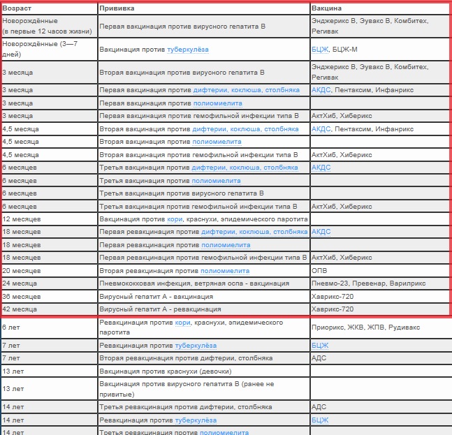 Первую дозу вводят детям в возрасте от 12 до 15 месяцев, а введение второй дозы — детям в возрасте от 4 до 6 лет.[5][6] Если с момента первой дозы прошло три месяца, вторую дозу можно принять раньше. Если ребенок никогда не был вакцинирован или не болел ветряной оспой, практикующий врач должен ввести две дозы с интервалом не менее 28 дней. Можно делать прививку от ветряной оспы одновременно с другими прививками; тем не менее, данные свидетельствуют о росте острого заболевания, когда введение вакцины против ветряной оспы происходит в течение четырех недель после введения вакцины против кори, эпидемического паротита и краснухи (MMR). Рекомендуется вводить вакцины одновременно в разные места для инъекций или с интервалом в четыре недели. Также существует четырехвалентная комбинированная вакцина под названием MMRV, которая состоит из MMR и ветряной оспы и может быть предоставлена вместо двух отдельных доз, если ребенку меньше 12 лет.