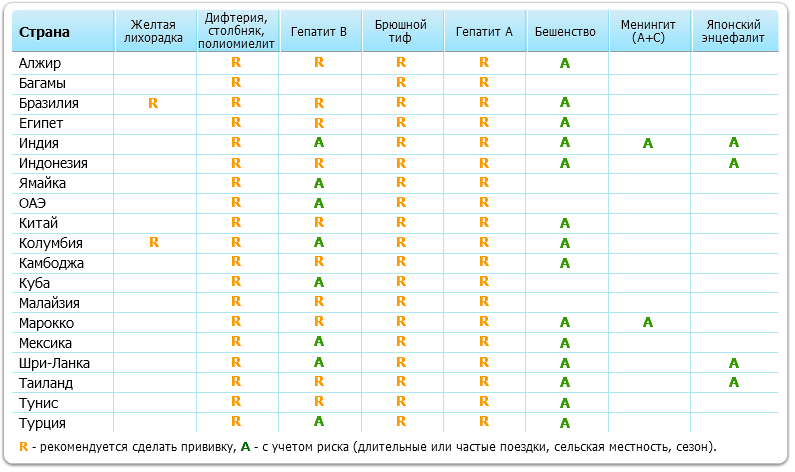 Желательны прививки от гепатита А и В, тифа, а если пребывание в стране ассоциировано со значительными контактами с животными, нужно привиться от бешенства. От туристов, отправляющихся на каникулы или в деловую поездку в Мексику, никаких подтверждений о наличии прививок по эпидемическим показаниям не требуется, достаточно плановых. Не нужны они и для въезда на Тайвань. Если вы планируете посетить Доминиканскую республику, желательна прививка от желтой лихорадки. В Нидерландах следует с осторожностью посещать национальные парки и лесные массивы, эти территории считаются энзоотичными по клещевому энцефалиту. Если соответствующая прививка сделана, отправляйтесь гулять по лесам, не опасаясь. В Швейцарии прививки требуют только от находившихся в районе эпидемий — за две недели до прибытия в эту страну.