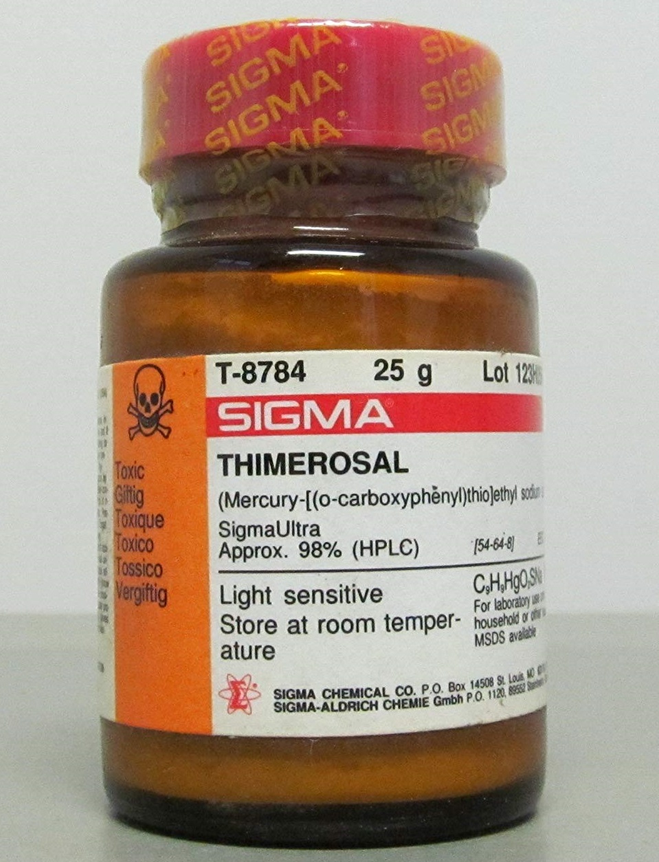 Тимеросал представляет собой консервант на основе ртути, который десятилетиями использовался в Соединенных Штатах во флаконах с несколькими дозами (флаконы, содержащие более одной дозы) лекарств и вакцин. Нет никаких доказательств вреда, причиняемого низкими дозами тимеросала в вакцинах, за исключением незначительных реакций, таких как покраснение и отек в месте инъекции. Однако в июле 1999 г. органы Службы общественного здравоохранения, Американская академия педиатрии и производители вакцин пришли к соглашению о том, что содержание тимеросала в вакцинах должно быть сокращено или исключено в качестве меры предосторожности.