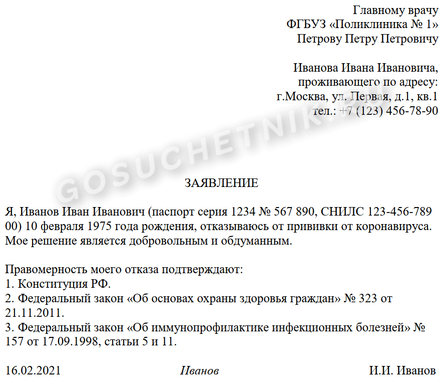 Образец заявления об отказе от вакцинации против коронавируса в 2021 году